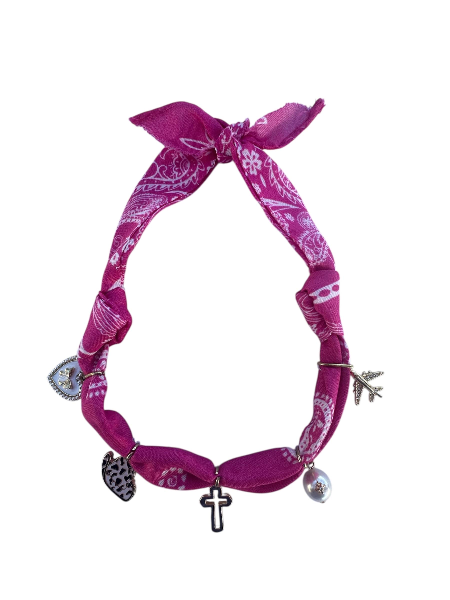 Beautiful charm necklace made with a knotted pink bandana. It features a gold cross in the center. Remaining charms are a pearl, leopard cowboy hat, heart, and an airplane. This choker measures 16" long from the knot (so an 8" drop when folded in half). Because it ties in the back the length can be adjusted.