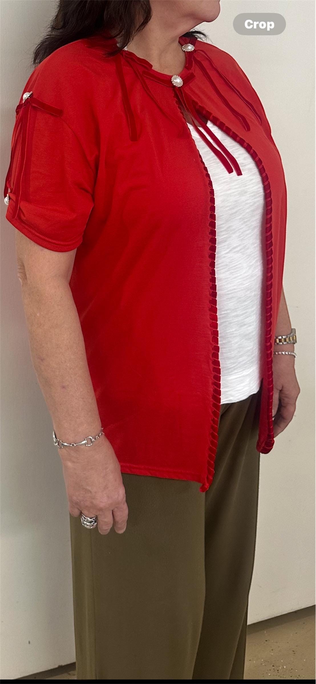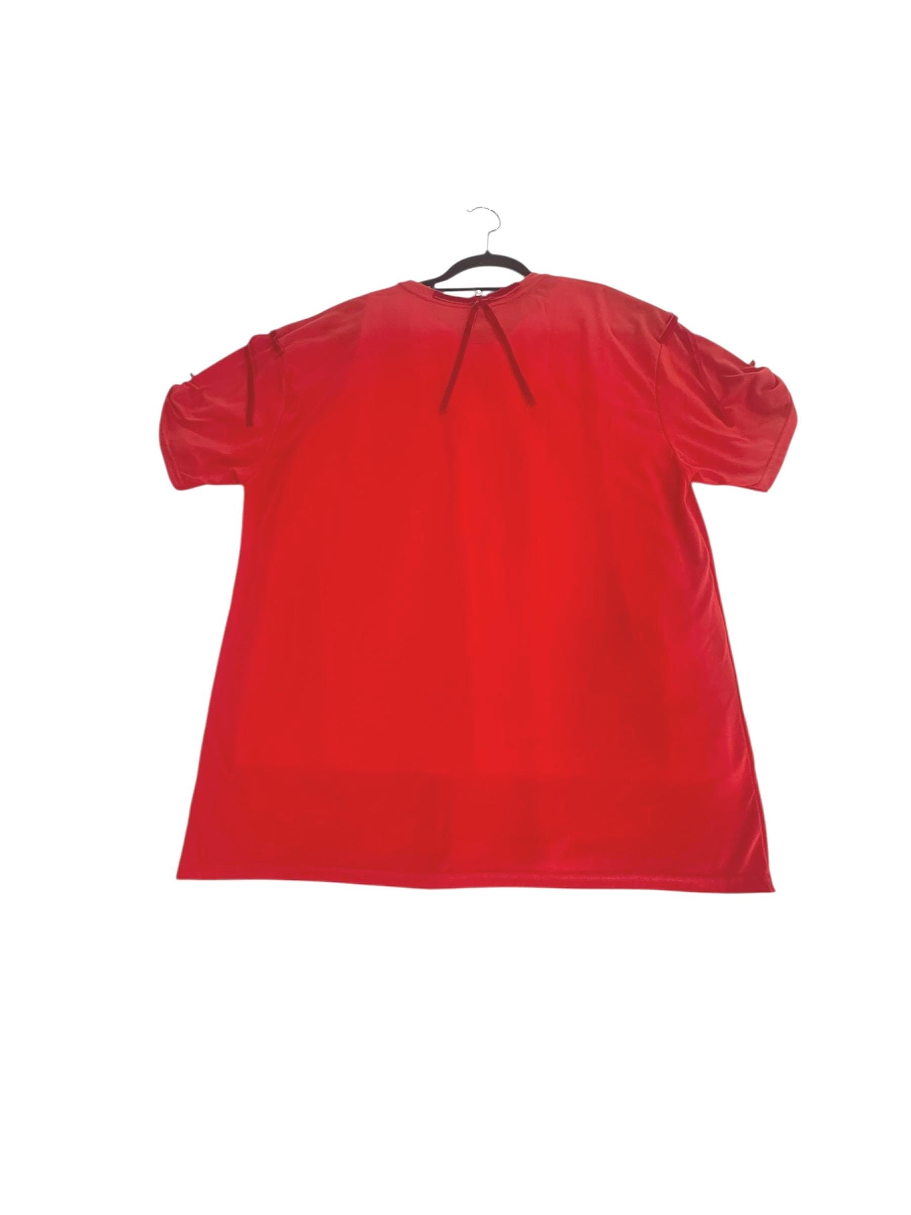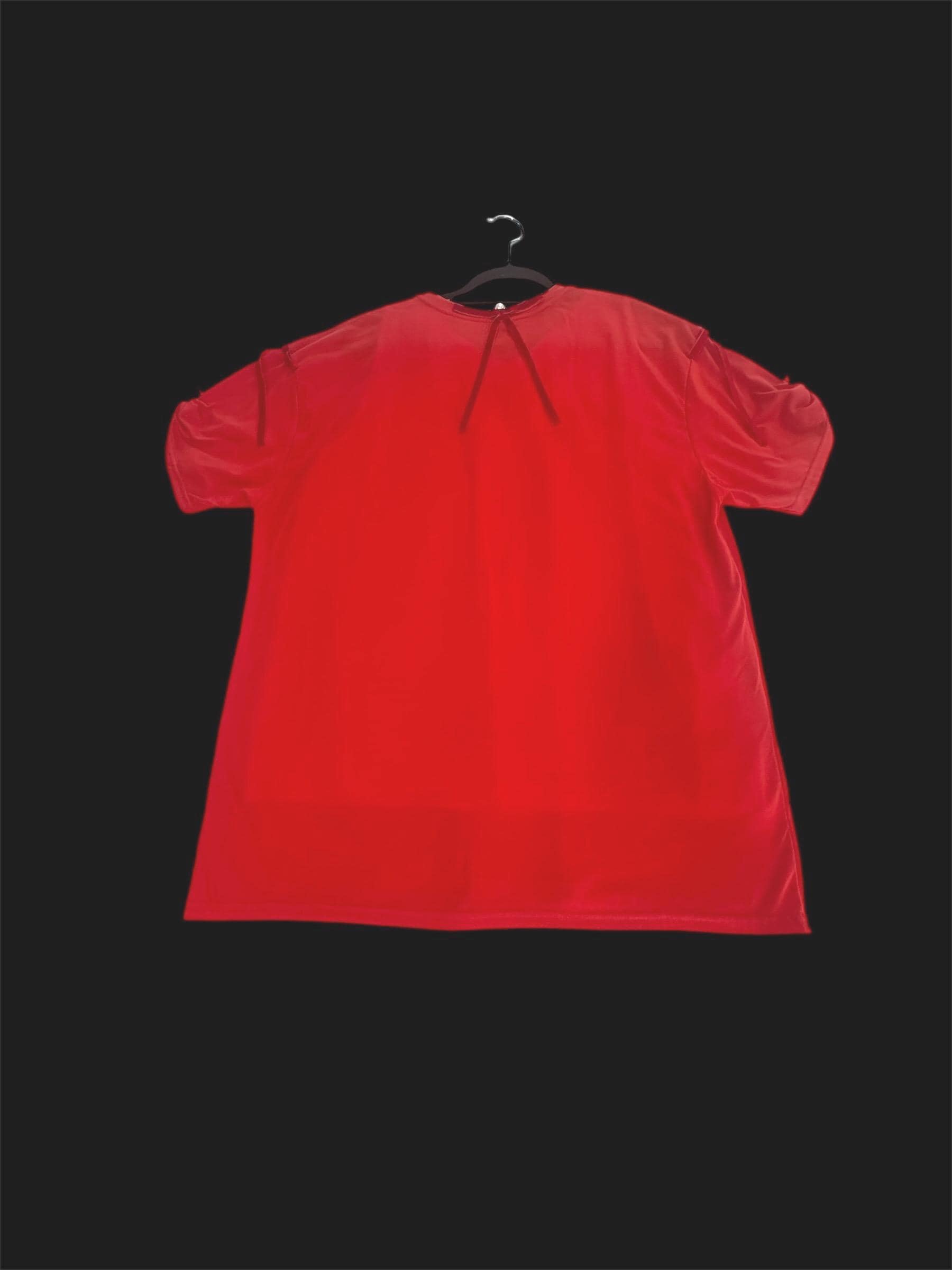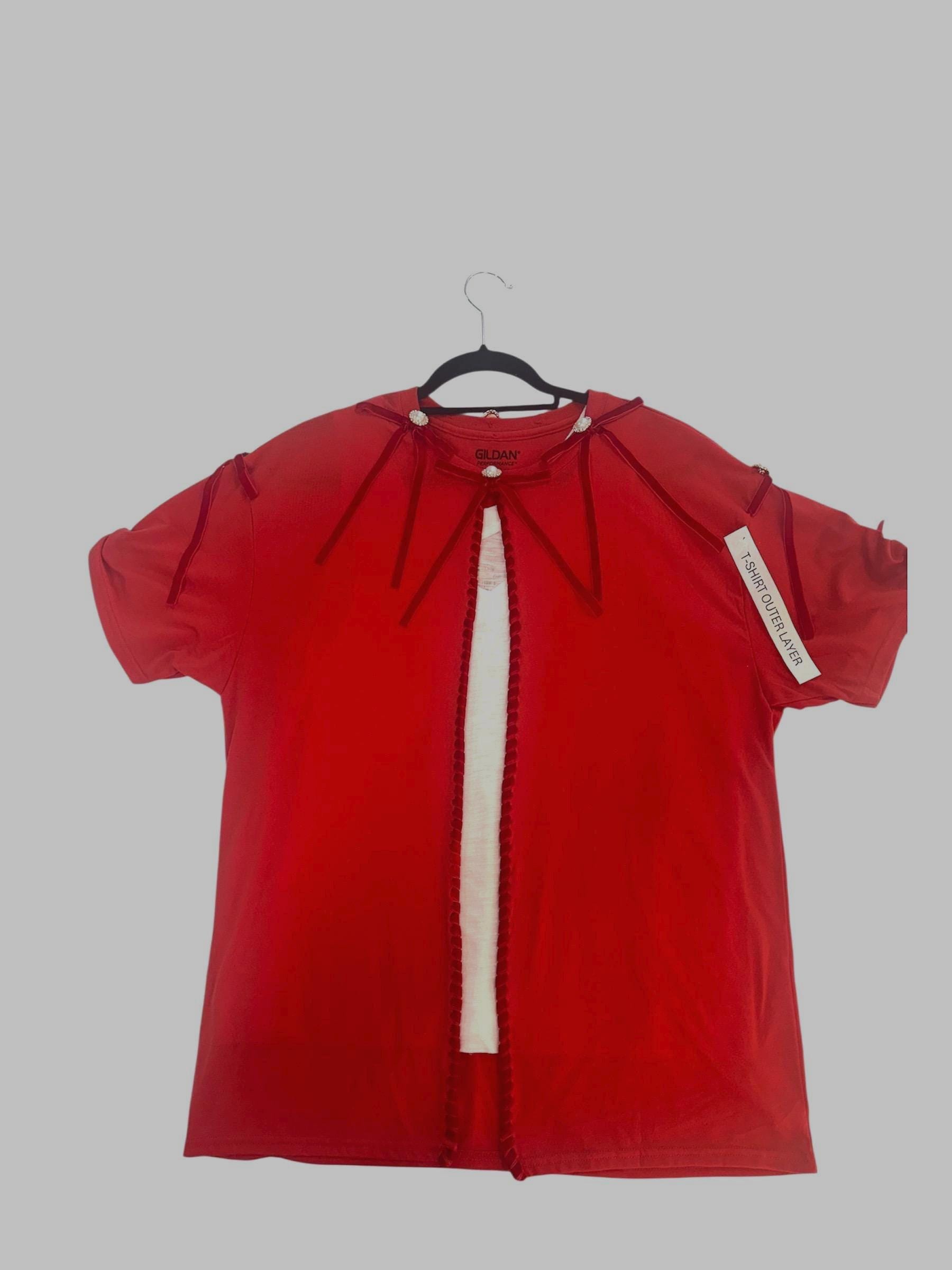 Outer Layer T-Shirt to be worn with your Tank Top. This T-Shirt acts like a Cover Up, Second Layer. This Red T-Shirt Outer Layer is made of 100% Polyester. The split front edges are laced with Polyester 3/8" Red Velvet Ribbon. There are bows made of the same ribbon with 3/4" diameter faux pearl/rhinestone buttons applied to their centers. Modifications on this T-Shirt were all done by hand. The T-Shirt is a size XL, but the design is meant to be oversized. Would work for ladies wearing sizes medium, large and extra large. Please see details in photos.