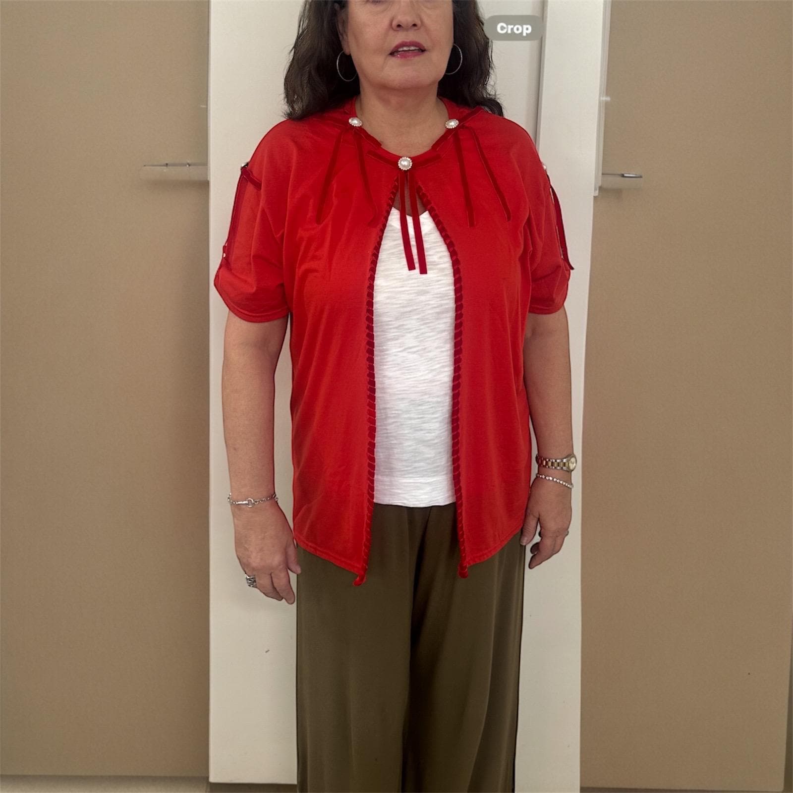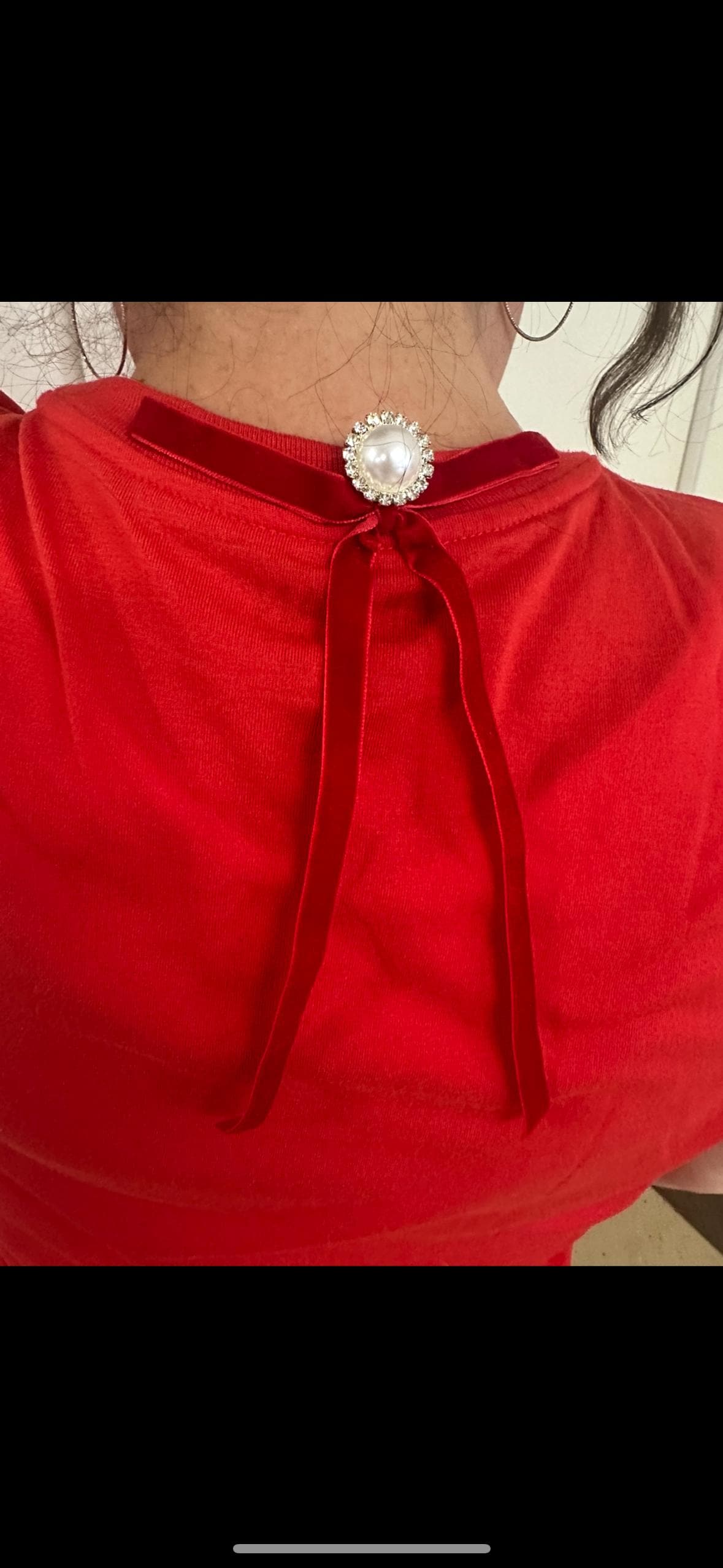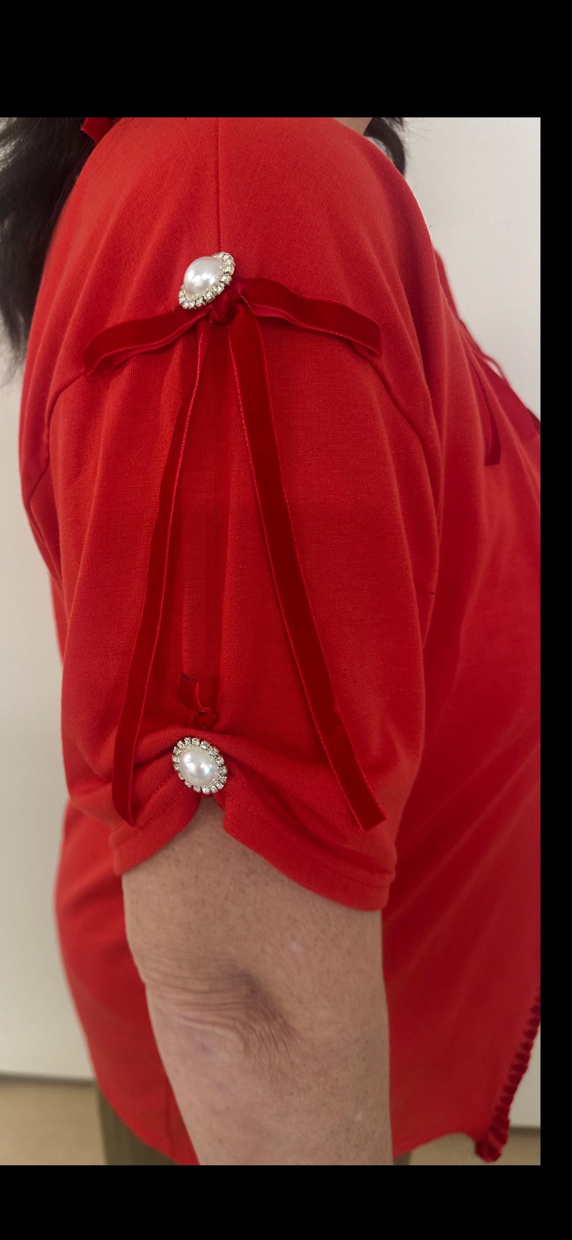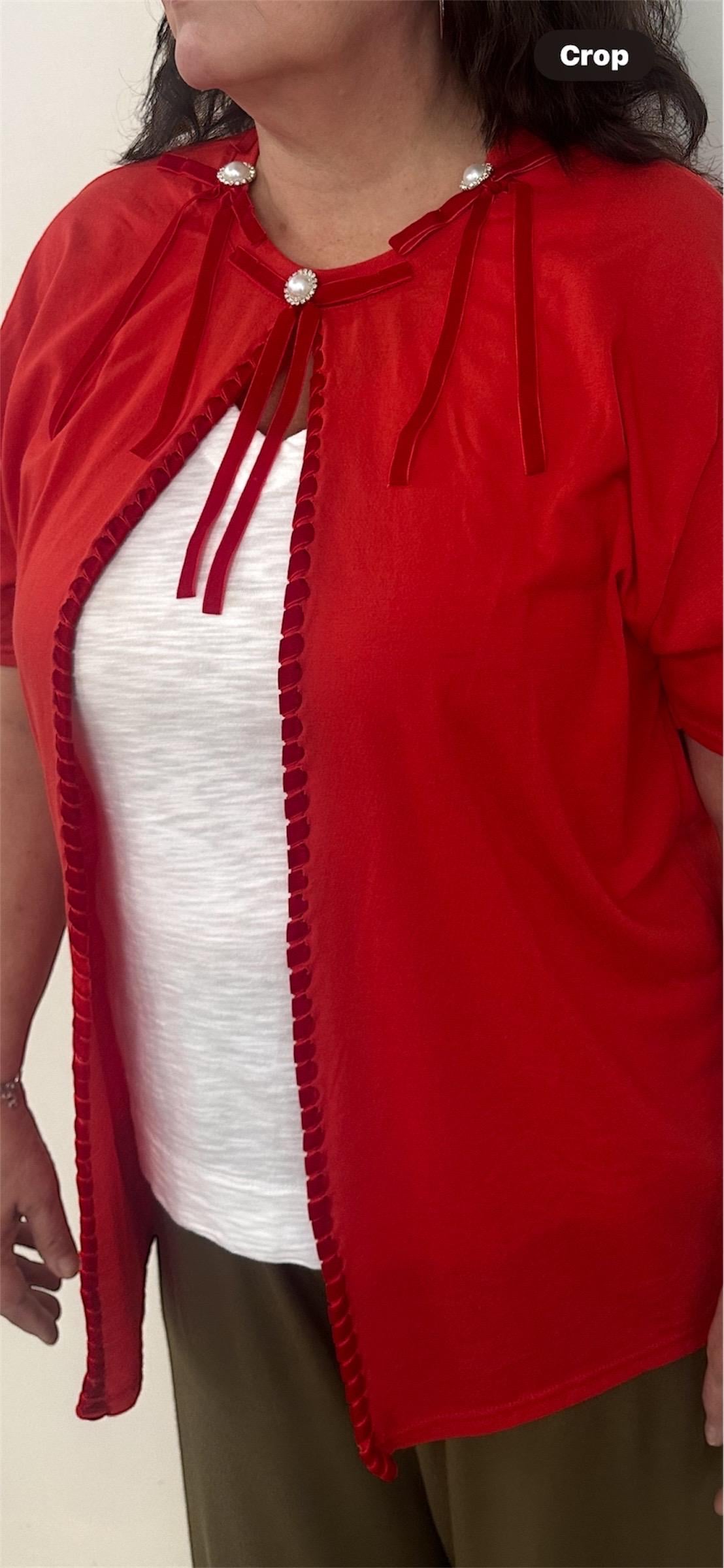 Outer Layer T-Shirt to be worn with your Tank Top. This T-Shirt acts like a Cover Up, Second Layer. This Red T-Shirt Outer Layer is made of 100% Polyester. The split front edges are laced with Polyester 3/8" Red Velvet Ribbon. There are bows made of the same ribbon with 3/4" diameter faux pearl/rhinestone buttons applied to their centers. Modifications on this T-Shirt were all done by hand. The T-Shirt is a size XL, but the design is meant to be oversized. Would work for ladies wearing sizes medium, large and extra large. Please see details in photos.